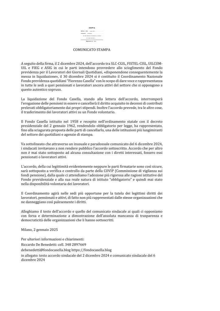 Il 30 dicembre 2024 si è costituito formalmente il coordinamento dei lavoratori dei quotidiani, con lo scopo di dare voce e rappresentanza in tutte le sedi a quei pensionati e lavoratori ancora attivi del settore che si oppongono a questo autentico sopruso.