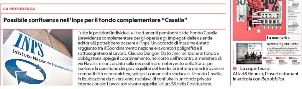 La manchette dedicata a noi. Con quell’imprecisione, non sappiamo se voluta, nel definire il nostro un comunicato “sindacale”. Su cui val la pena precisare: il Coordinamento c’è perché il sindacato non ha fatto il suo dovere istituzionale. Se avesse scelto la via della tutela integrale dei soldi versati dai lavoratori non si sarebbe trovato a questo punto di discredito. L’azione del sindacato in questi ultimi decenni è stata contro gli interessi dei lavoratori. Non solo, ma accettando il ricatto degli editori.. “si rinnova il contratto se cancellate il Casella”, il sindacato ha aizzato lavoratori attivi contro pensionati, alimentando una guerra tra poveri insulsa e deleteria per la stessa forza contrattuale del sindacato.